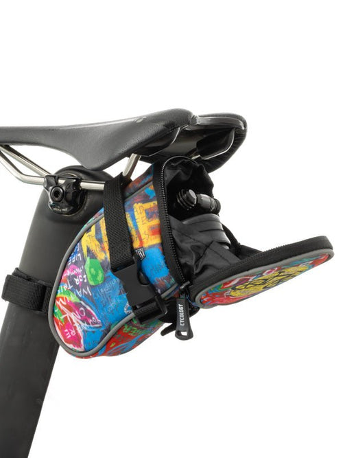 Se fixant facilement sous votre selle avec des sangles velcro et des boucles réglables, il vous permet de transporter vos outils de rechange, chambres à air, démonte-pneus, collations, argent, clés, une mini pompe et tout le reste en toute confiance. Pour plus de sécurité et de visibilité, il est également doté d'un passepoil réfléchissant sur toutes les coutures et d'un design original et élégant Cycology.