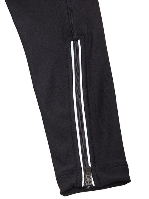 Reflective strips on side leg zippers at ankles