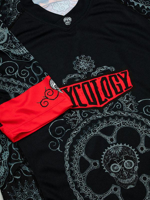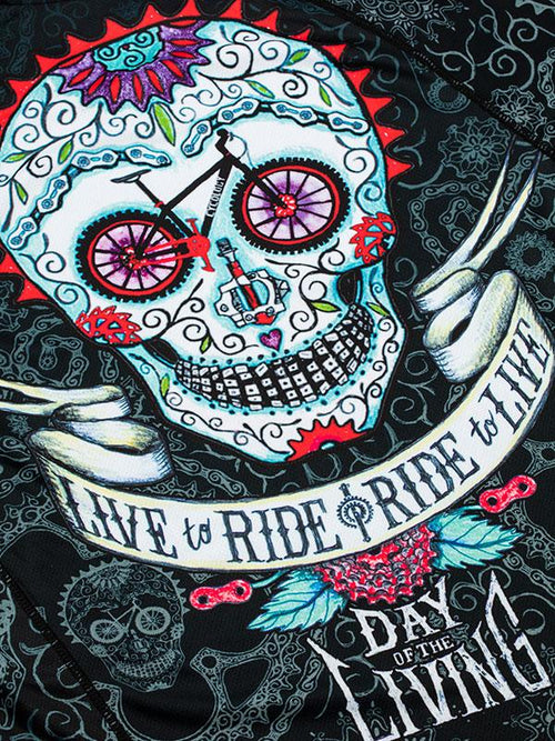 Notre Cycling Skull Art fait de pièces de VTT. Affichez un ensemble souriant de dents de pneus VTT pendant que vous pédalez sur des sentiers de terre, totalement le jour de la vraie vie. Que vous parcouriez les sentiers pendant quelques heures ou que vous partiez toute la journée, notre maillot VTT possède toutes les caractéristiques dont vous aurez besoin pour vous permettre de rouler confortablement.