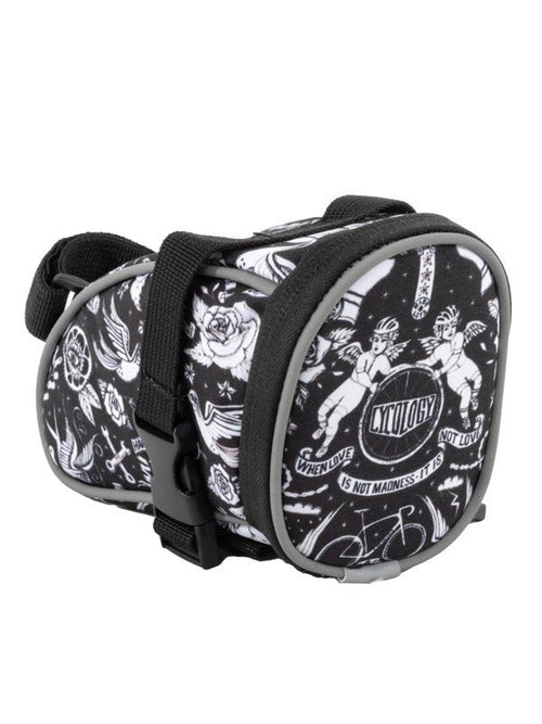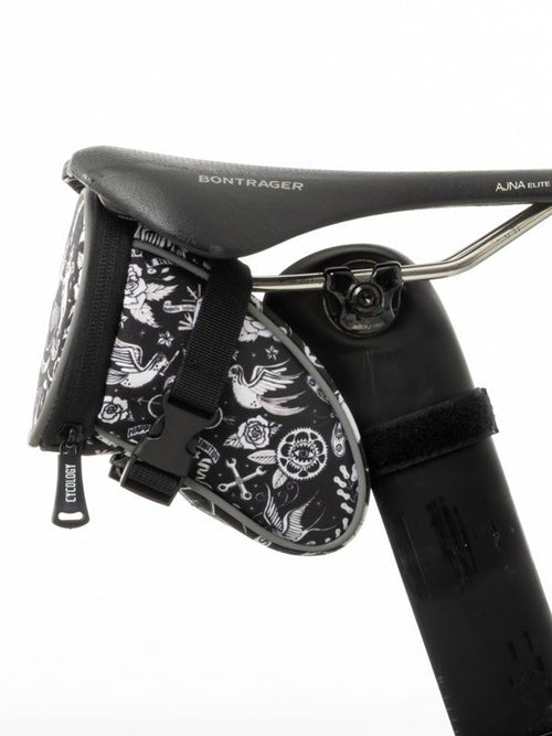 Se fixant facilement sous votre selle avec des sangles velcro et des boucles réglables, il vous permet de transporter vos outils de rechange, chambres à air, démonte-pneus, collations, argent, clés, une mini pompe et tout le reste en toute confiance. Pour plus de sécurité et de visibilité, il est également doté d'un passepoil réfléchissant sur toutes les coutures et d'un design original et élégant de Cycology.
